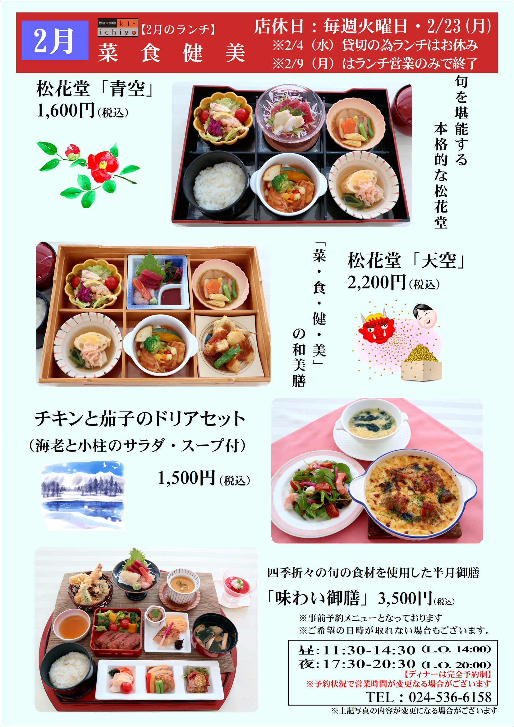 2月ランチのご案内 2026年1月26日 PDFはこちら コラッセふくしま12階レストランki-ichigoより2月ランチのご案内です。 美活&健康ランチ!旬を堪能する松花堂「青空」「天空」 冬のごちそう、ほっと温まる「チキンと茄子のドリアセット」 四季折々の旬の食材を使用した半月御膳「味わい御膳」 など 人気のメニューをご用意しております。 ご来店を心よりお待ちしております。 シェアするツイートする