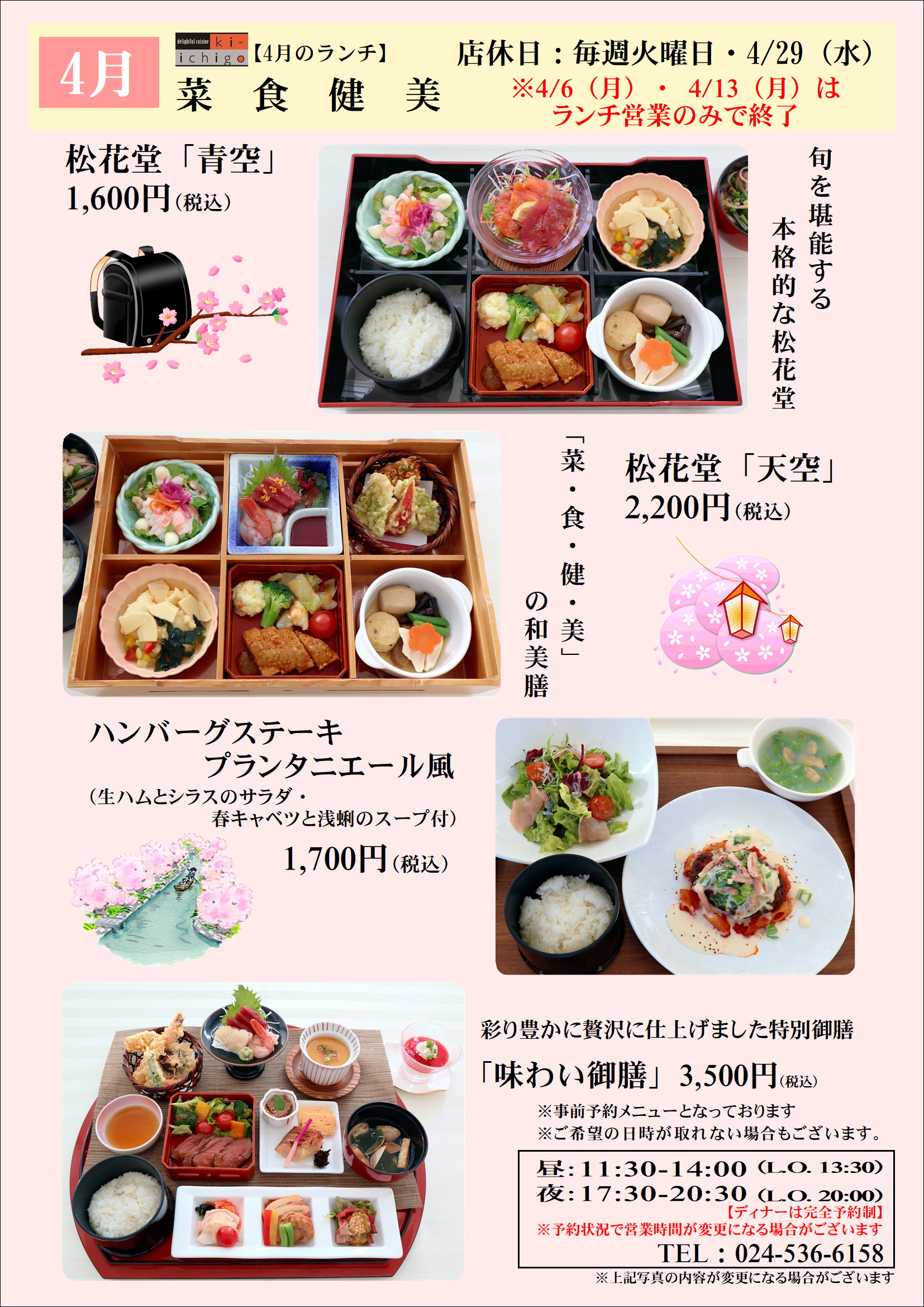 4月ランチのご案内 2026年3月23日 PDFはこちら コラッセふくしま12階レストランki-ichigoより4月ランチのご案内です。 美活&健康ランチ!旬を堪能する松花堂「青空」「天空」 春を味わうご褒美ハンバーグ「ハンバーグステーキ プランタニエール風」 彩り豊かに贅沢に仕上げました特別御膳「味わい御膳」 など 人気のメニューをご用意しております。 ご来店を心よりお待ちしております。 シェアするツイートする